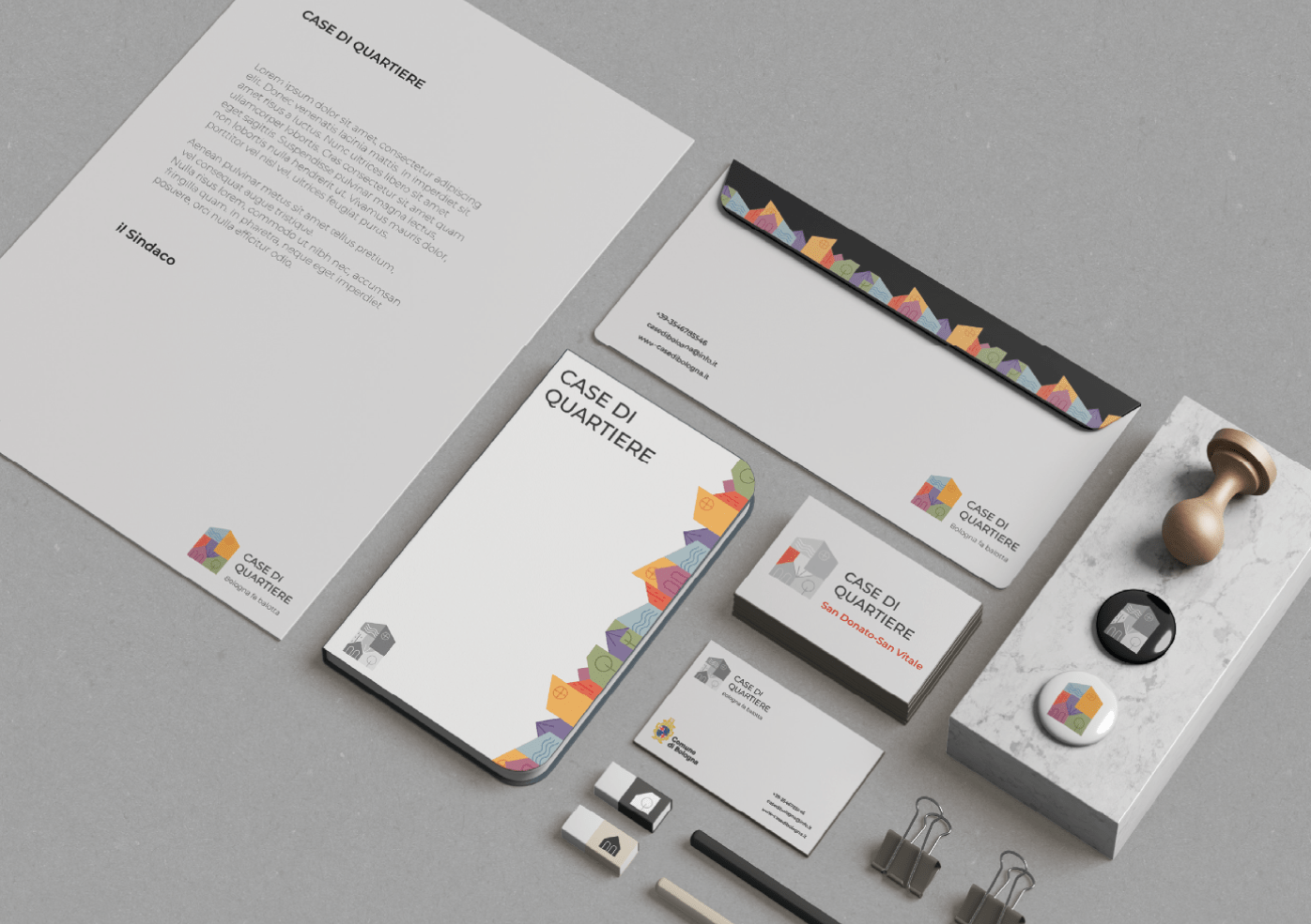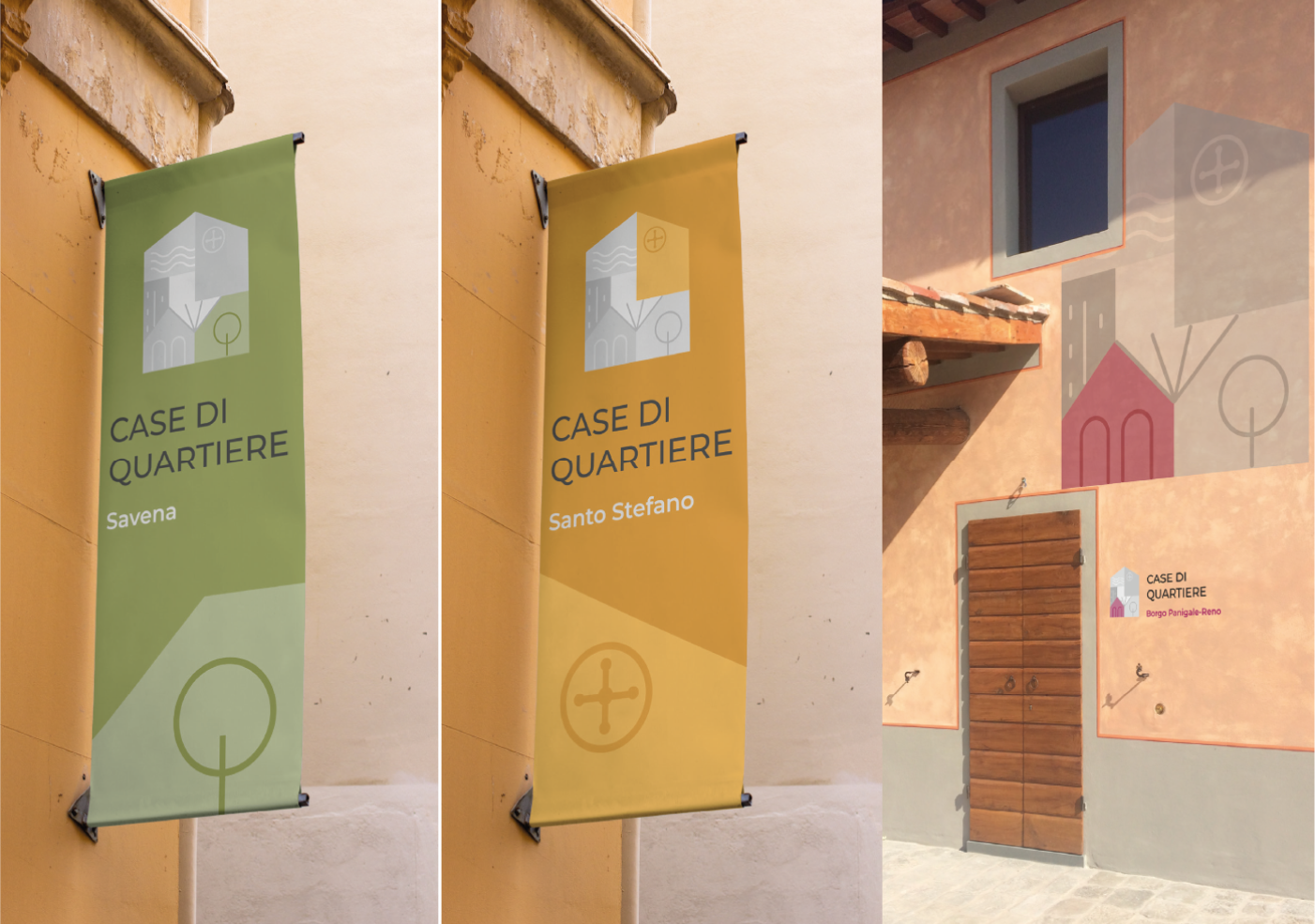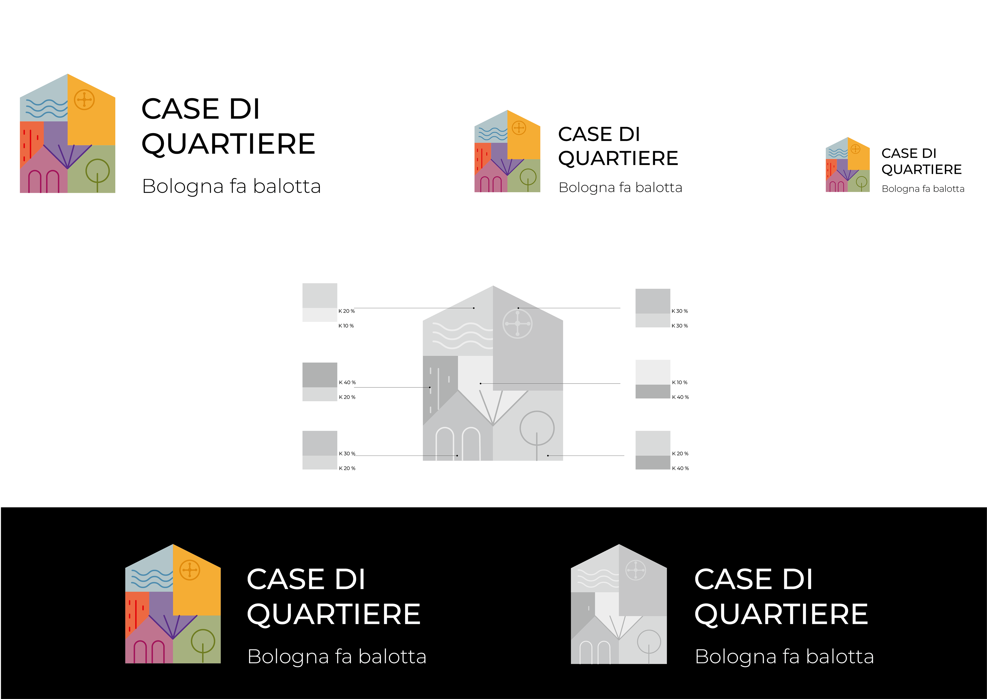 It consists of a pictogram, the logotype "CASE DI QUARTIERE," and the payoff "Bologna fa balotta," a local Bolognese expression meaning "to cooperate, to unite."