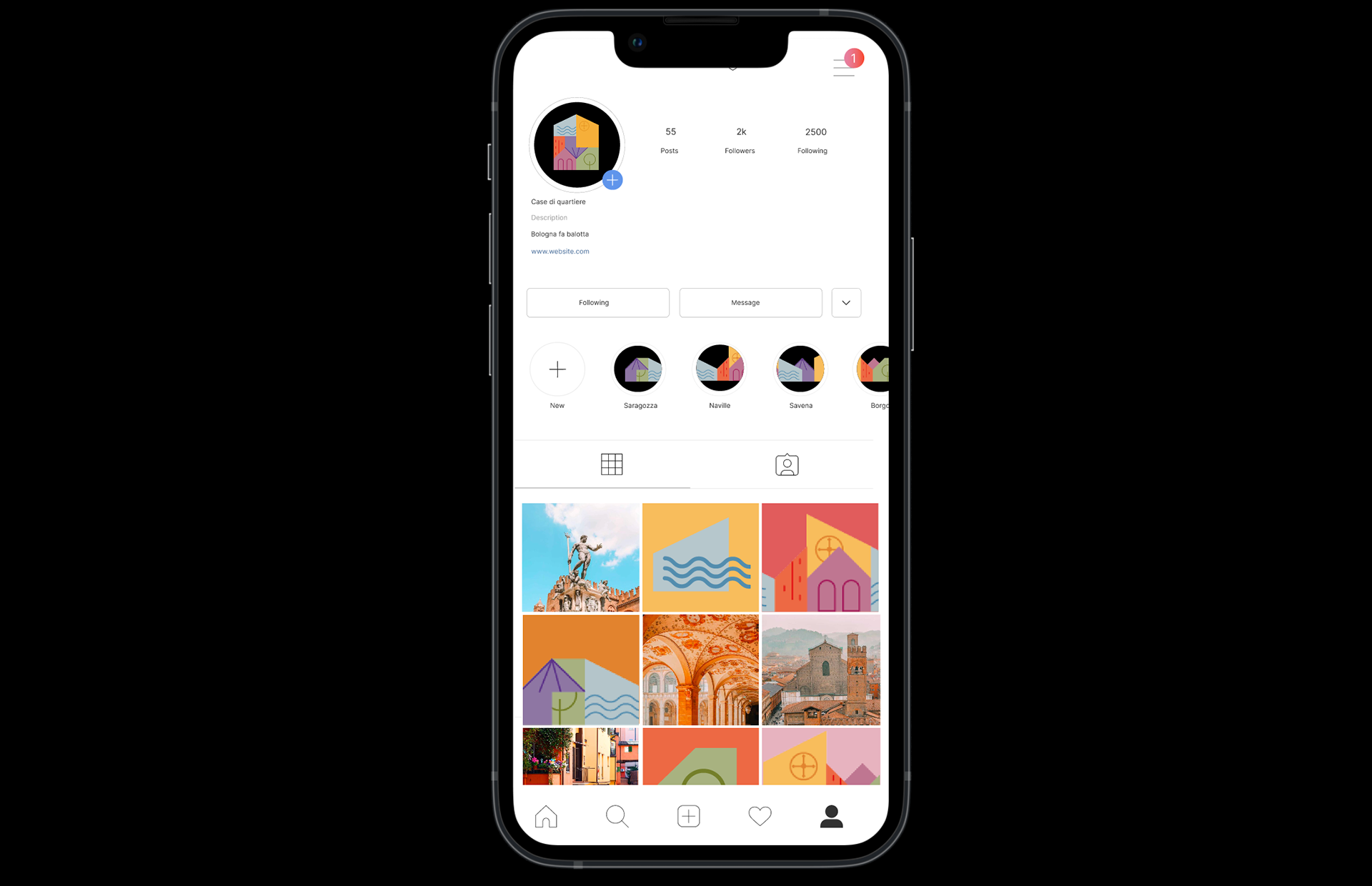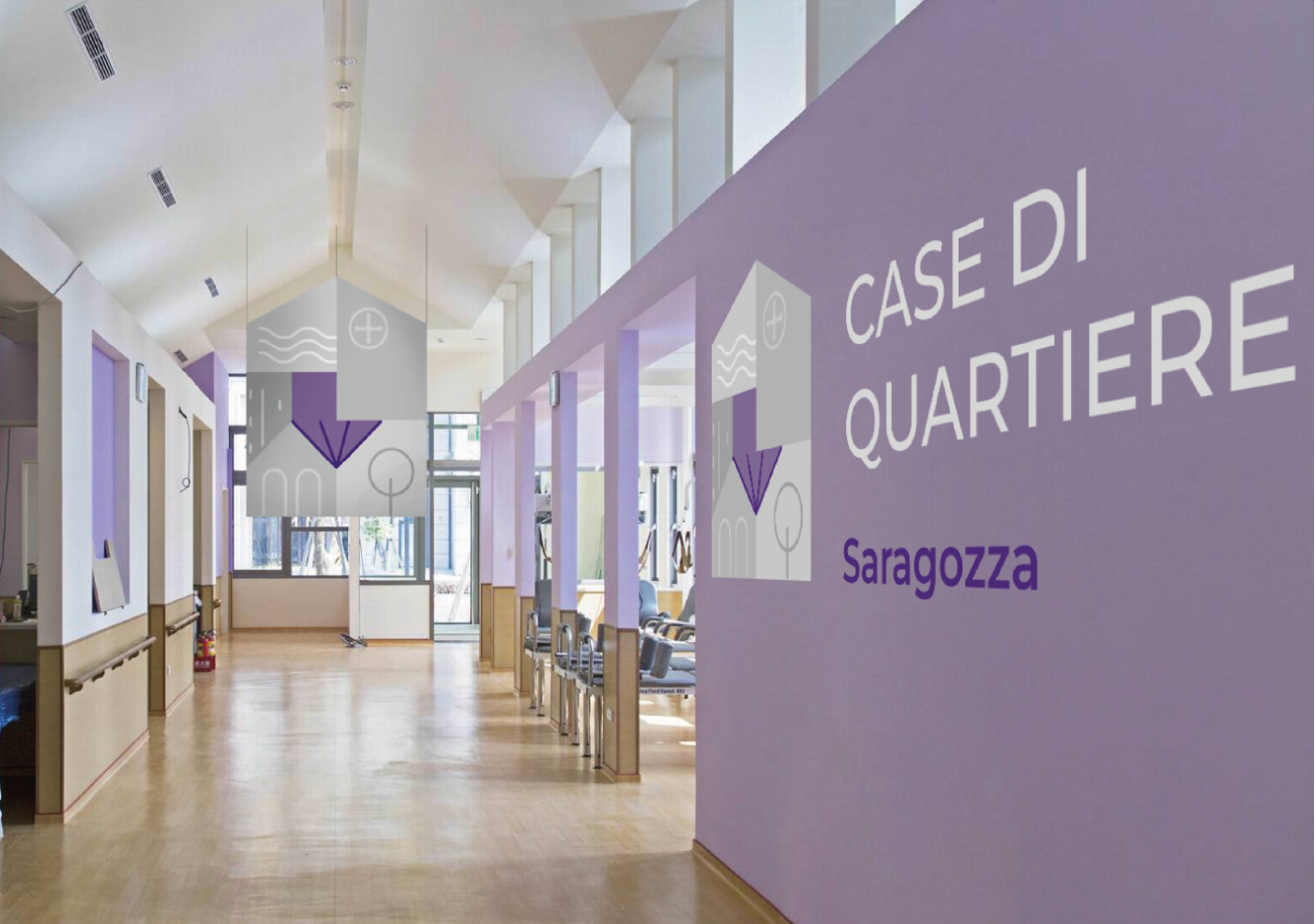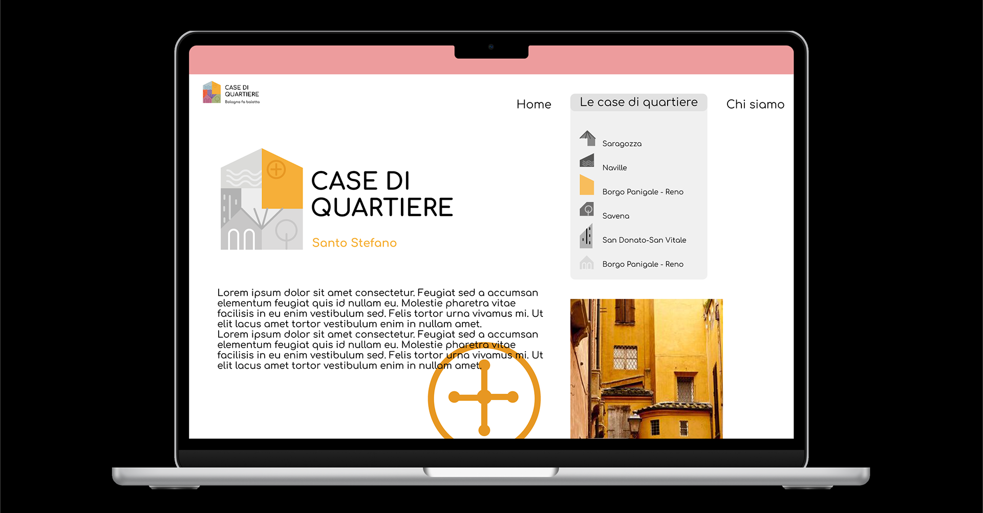 It consists of a pictogram, the logotype "CASE DI QUARTIERE," and the payoff "Bologna fa balotta," a local Bolognese expression meaning "to cooperate, to unite."