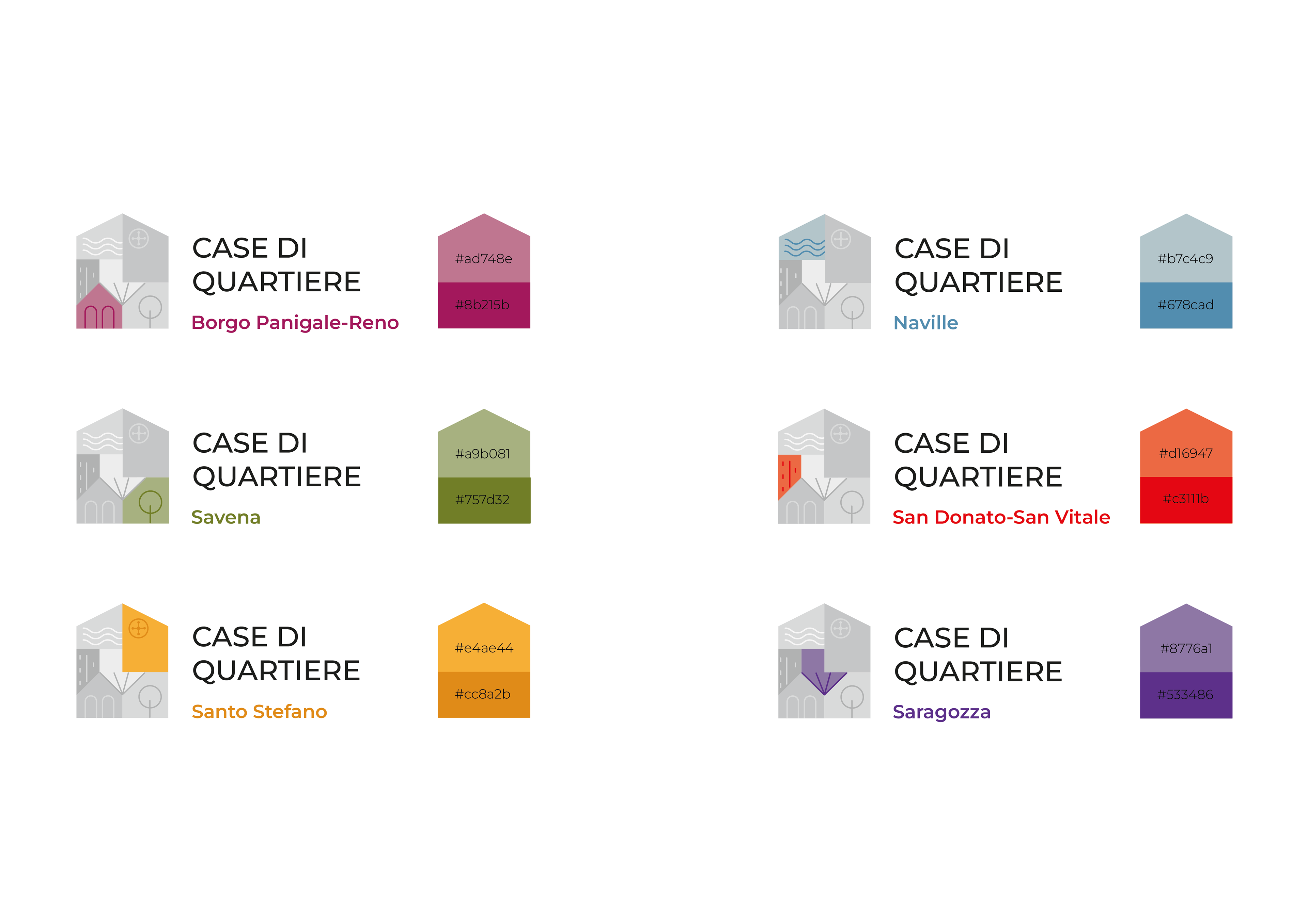 For each variant, the payoff of the main logo makes room for the specific neighborhood name and is "illuminated" by its corresponding color code.